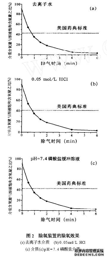 磷酸鹽緩沖溶液(pH = 7. 4) 。將三種介質(zhì)分別放入溶解裝置, 然后通入氦氣, 在37 ℃、攪拌漿轉(zhuǎn)速100rpm 條件下,通氣6min。除氧裝置的除氧效果如圖2 所示。這種方法適用于各類(lèi)介質(zhì),氦氣使用量很低,只要1min 就可達(dá)到美G藥典的要求,有望得到廣泛應(yīng)用。